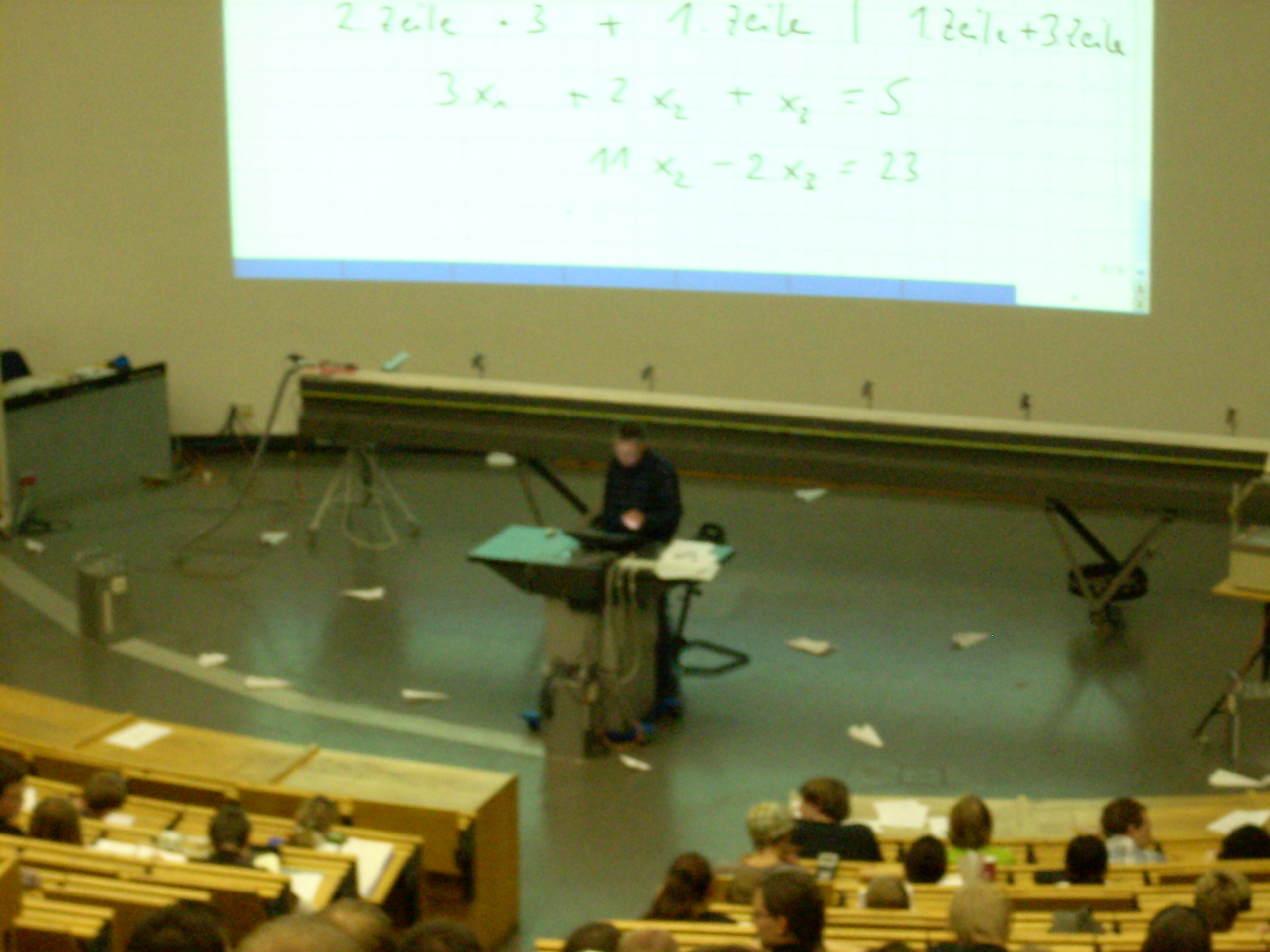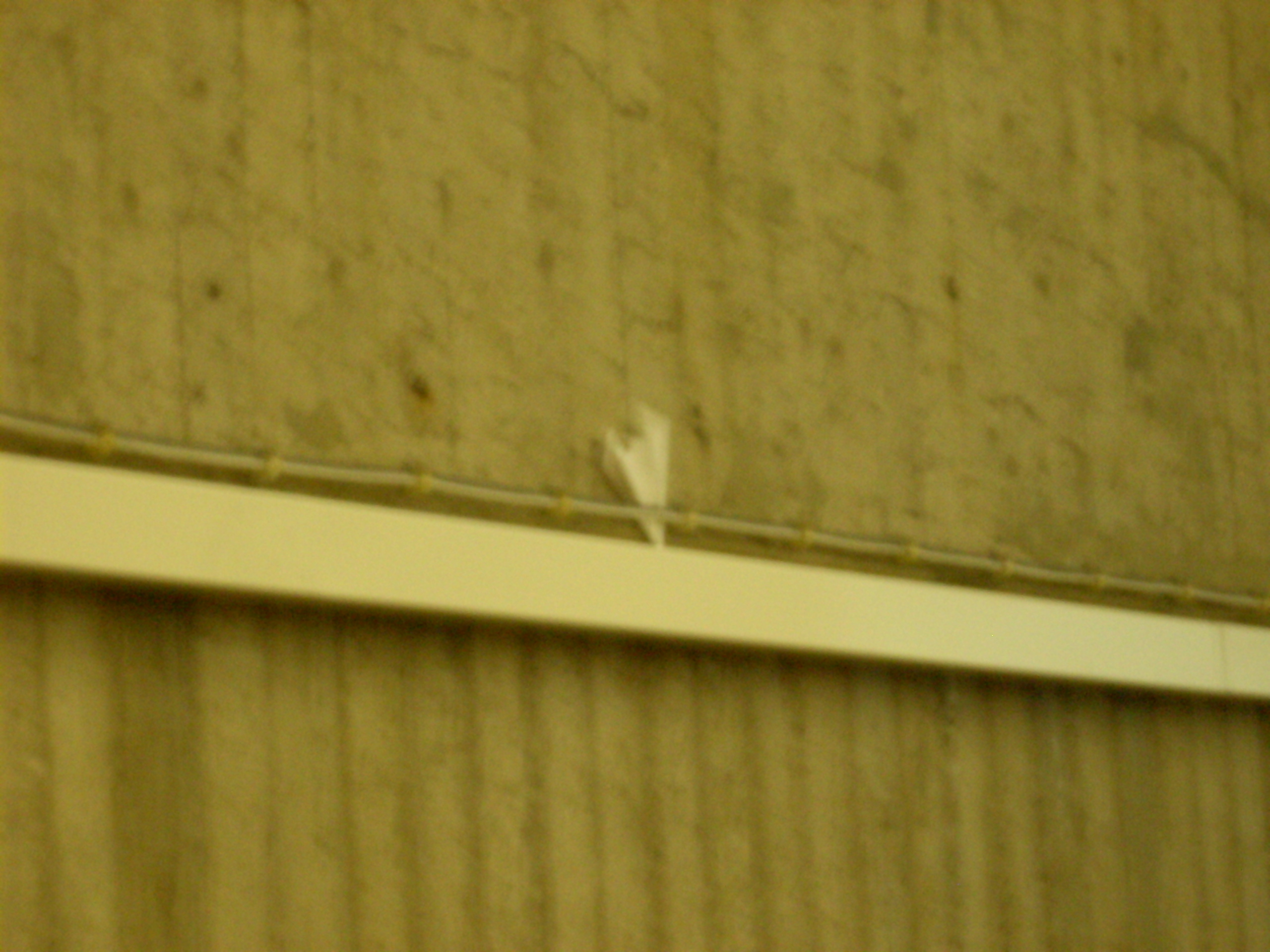 Dementsprechend kreativ sind die diversen fast-Studenten: Die einen haben sich nen Laptop mitgebracht und spielen die ganze Zeit irgendwelche Spiele (warum sind sie gekommen? man kann doch auch zu Hause spielen...), andere bauen sich aus Papier kleine Propeller, die sie dann durch den steten Luftstrom der Lüftungsschlitze zwischen den Sitzen drehen lassen. Die meisten werfen allerdings Schwalben. Etwa 1/3 der geworfenen Schwalben haben die (wie nennt man das Bühne vermutlich nicht, oder?) erreicht, der Rest stürzt dazwischen irgendwo ab. Heute bin ich endlich mal dazu gekommen, das Ergebnis zu fotografieren, aufgrund meiner einfachen Kamera und meiner miserablen Fotografietechnik sind die Bilder allerdings in mieser Qualität, aber man kanns erkennen. Eine Schwalbe steckt sogar ca. 3 bis 4 Meter hoch zwischen der Wand und einem Kabel fest: